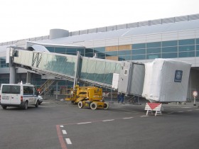 30.03. - prst C nového terminálu Sever 2 na Ruzyni byl již osazen nástupními mosty. Na snímku nový most u stojánky 20