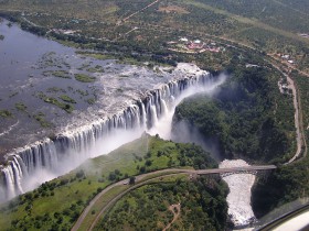 Za aktualni situace je ale mozna lepsi letet na zambijskou stranu do Livingstone (LVI) - i tam se da z JNB dostat vcelku snadno. Mozna nekteri touroperatori maji porad pod kontrolou i zimbabwskou stranu (letiste VFA), ale pro individualni cestovatele je preci jenom lepsi Zambie (na teto fotce za mostem, reka tvori hranici).