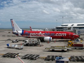 Jedna z B737-800 společnosti Pacific Blue před odletem z Aucklandu