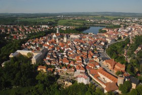Centrum města Tábora focené od západu směrem na východ v pozdním odpoledni. V popředí vpravo dole je pivovar a věž Kotnov (bývalý hrad), v pozadí centra města je dobře patrná vodní nádrž Jordán.